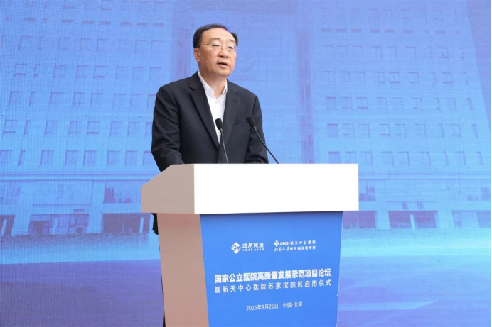 9月26日,國家公立醫院高質量發展示范項目論壇暨通用技術集團所屬航天中心醫院蘇家坨院區啟用儀式在京舉行。通用技術集團董事長、黨組書記于旭波,北京市海淀區委書記、中關村科學城黨工委書記張革,北京市醫療保障局黨組成員、副局長顏冰出席活動并致辭。集團董事、黨組副書記馬可輝,海淀區委常委、常務副區長岳立,海淀區委常委、區政法委書記、區委辦主任程培衡,北京市醫保中心主任楊菁,海淀區政府黨組成員,區政府辦黨組書記、主任劉釗,海淀區衛生健康委、市場監管局、醫療保障局、蘇家坨鎮政府、海融達公司主要負責人出席活動。